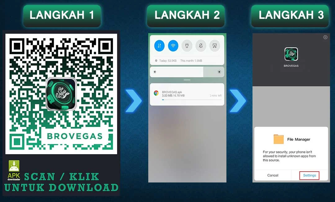 1. KLIK LOGO BARCODE / SCAN BARCODE UNTUK MEMULAI DOWNLOAD APLIKASI. SETELAH SELESAI SILAKAN BUKA FILE MANAGER DAN BUKA FILE APLIKASI BROVEGAS.apk